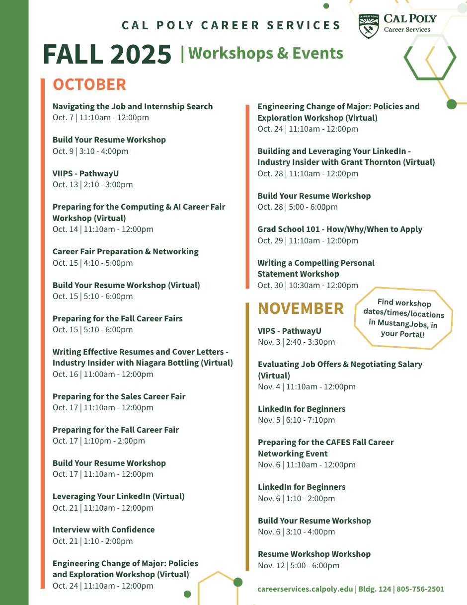 To view our events open to all students and to register for our workshops and events log into MustangJobs (found in your CP Portal) or check them out on Cal Poly Now.